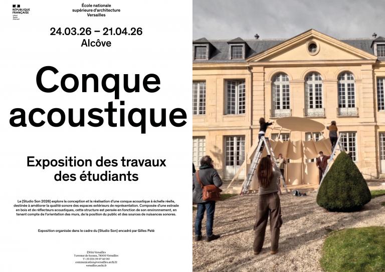Le[Studio Son 2026] explore la conception et la réalisation d’une conque acoustique à échelle réelle, destinée à améliorer la qualité sonore des espaces extérieurs de représentation. Composée d’une estrade en bois et de réflecteurs acoustiques, cette structure est pensée en fonction de son environnement, en tenant compte de l’orientation des murs, de la position du public et des sources de nuisances sonores.