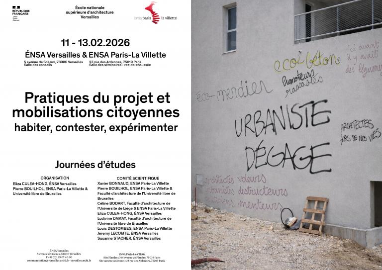 Ces journées d’études, organisées par Eliza Culea-Hong (ÉNSA Versailles) et Pierre Bouilhol (ENSA Paris-La Villette), se tiendront du 11 au 13 février 2026 à l’ÉNSA Versailles et à l’ENSA Paris-La Villette, et proposeront une réflexion sur les pratiques du projet et les mobilisations citoyennes : habiter, contester, expérimenter.