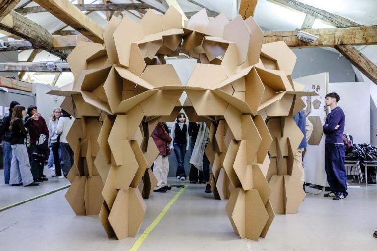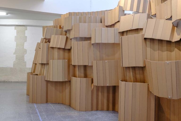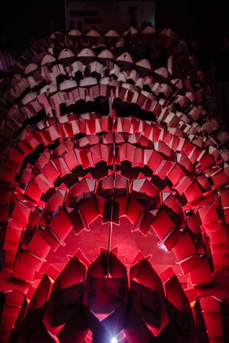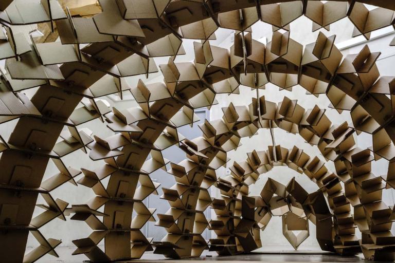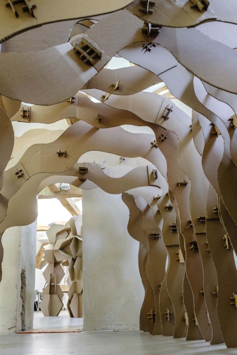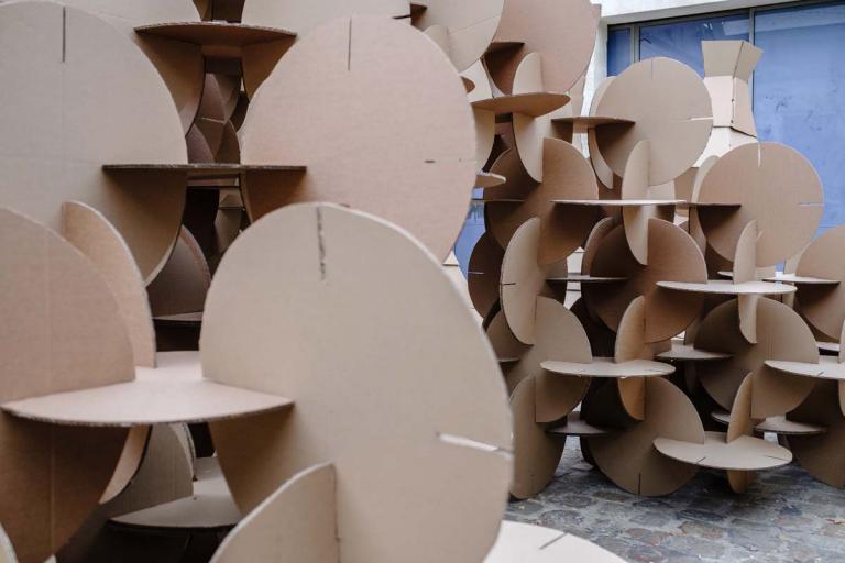 Le studio de projet vise à placer les étudiants dans une situation d’expérimentation de la construction à échelle 1. Il s’agit d’imaginer un petit édifice, d’abord par le dessin, ensuite par la maquette, puis de le construire à échelle 1 avec des tubes de cartons. Ce petit édifice, d’environ 5 m2 au sol et 4 mètres de hauteur, doit accueillir 4 à 6 personnes. Avec une initiation à la conception et à la fabrication numérique, ainsi qu’à la construction pratique, les étudiants acquièrent très rapidement des connaissances concernant les possibilités techniques et esthétiques du tube de carton – coupes et modes d’assemblages, tout en imaginant des volumes et des formes complexes. Cet apprentissage de la conception à échelle 1 permet aux étudiants de percevoir et d’expérimenter réellement les notions de base de la conception à la construction, avec une articulation immédiate, voire intuitive, entre la pratique numérique et la pratique manuelle, ainsi que le corps à corps avec la matière : la spatialité, la forme, la structure, les techniques constructives, la résistance des matériaux, les contraintes du contexte.